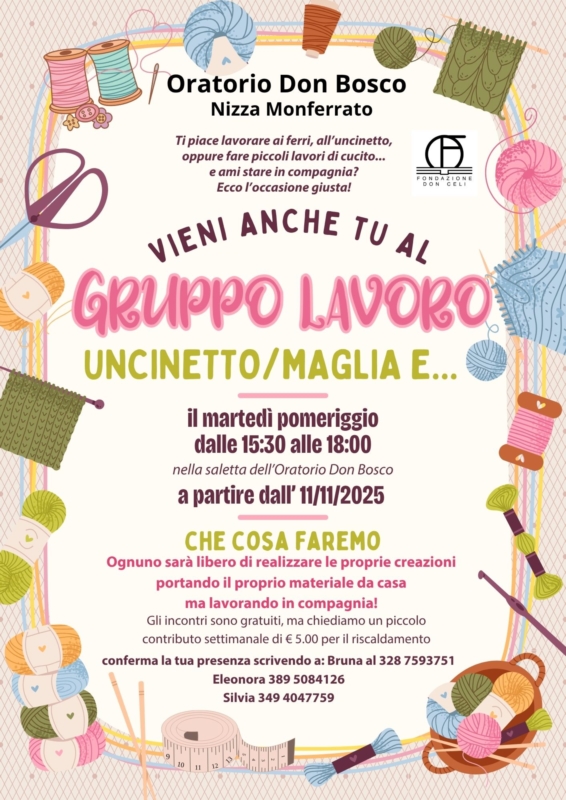 Se ami lavorare a maglia, all'uncinetto, o dedicarti a piccoli lavoretti di cucito in buona compagnia, l'Oratorio Don Bosco di Nizza Monferrato ha l'iniziativa che fa per te. A partire da martedì 11 novembre 2025, prenderà il via il "Gruppo Lavoro Uncinetto/Maglia e...", un appuntamento settimanale dedicato alla creatività e alla socialità.