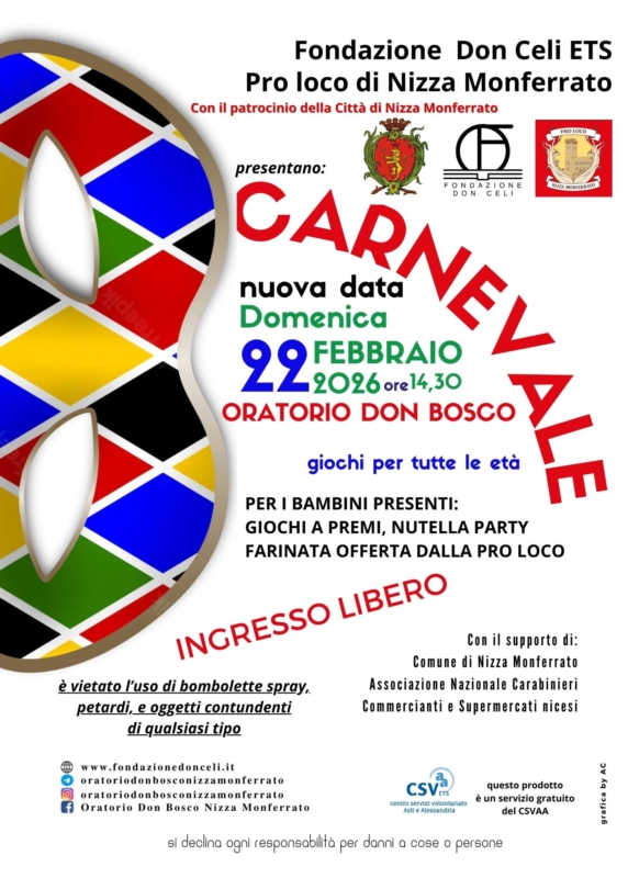 Domenica 22 febbraio 2026, aspettiamo i ragazzi all'Oratorio Don Bosco (ore 14:30) per festeggiare insieme il Carnevale!