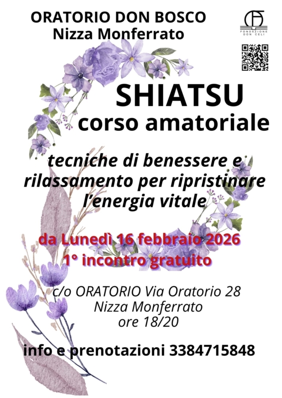 Dopo il successo riscontrato nel 2025, la Fondazione Don Celi ETSè lieta di riproporre il corso amatoriale di Shiatsu presso l’Oratorio Don Bosco di Nizza Monferrato.