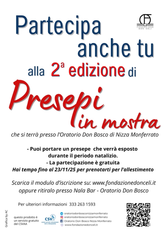 La Fondazione Don Celi è lieta di annunciare la 2ª edizione di "Presepi in mostra" 2025/26, che si terrà presso la Chiesa dell'Oratorio Don Bosco di Nizza Monferrato.