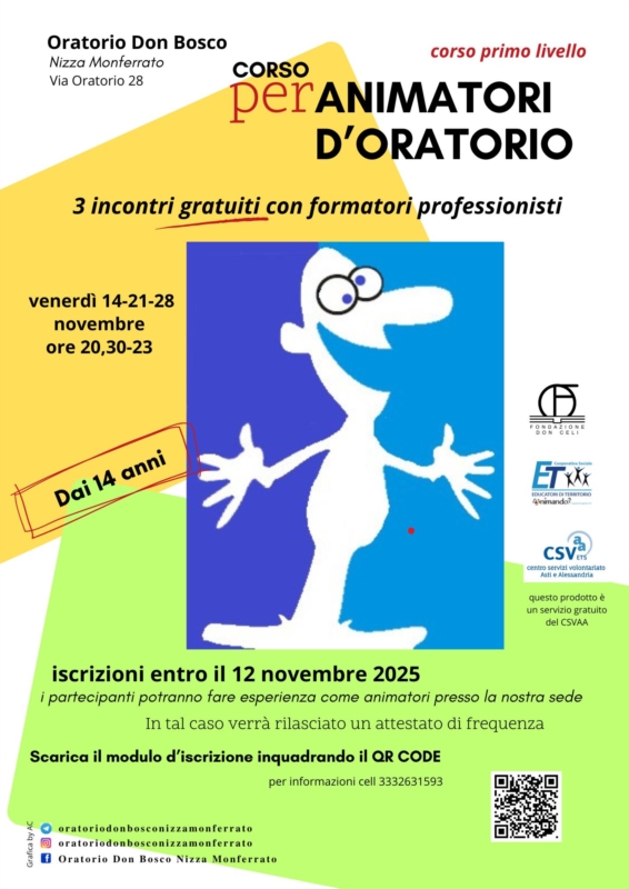 L’attesa è finita per tutti i giovani dalla terza media in avanti (non ci sono limiti massimi per l'età) che desiderano mettersi in gioco e diventare protagonisti attivi della vita d'Oratorio. L'Oratorio Don Bosco di Nizza Monferrato, in Via Oratorio 28, è pronto ad ospitare il nuovo Corso di primo livello per Animatori d'Oratorio, un'opportunità di formazione completamente gratuita.