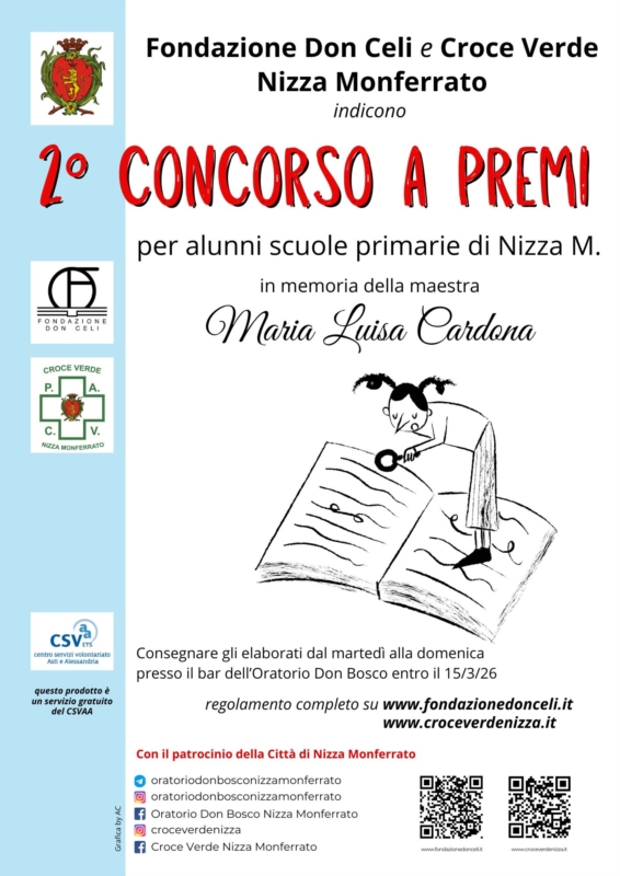 La Fondazione Don Celi ETS e la Pubblica Assistenza Croce Verde Nizza Monferrato, con il patrocinio del Comune di Nizza Monferrato, promuovono il “2° Contest grafico‑letterario Maestra Maria Luisa Cardona”, concorso gratuito rivolto agli alunni delle scuole primarie “E. Rossignoli” e “N.S. delle Grazie”. L’iniziativa nasce per ricordare la maestra Maria Luisa Cardona e il suo profondo amore per l’istruzione, per i bambini e per la città, trasmettendo alle nuove generazioni valori di pace, solidarietà e convivenza serena.